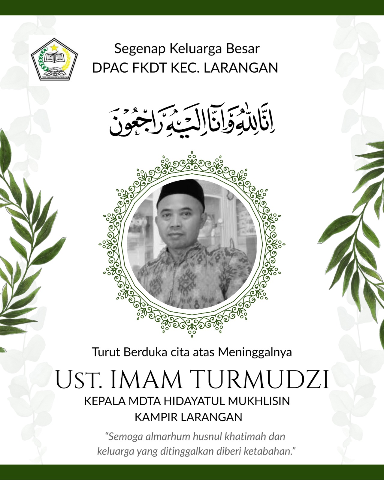 Innalilahi wa Innailaihi roji’un telah meninggal dunia Imam Turmudi, pejuang Madrasah Diniyah Takmiliyah MDT dari dukuh Kampir Kec Larangan.Al Marhum meninggal pada hari Kamis sore, 25 September 2025 karena penyakit jantung. Dia menjadi Kepala Madrasah Diniyah Takmiliyah Hidayatul Mukhlisin dukuh Kampir Kec Larangan Kab Brebes. Berita duka meninggalnya Ust Imam Turmudzi menyebar di WAG FKDT Kec Larangan.